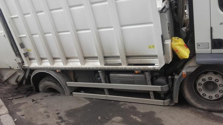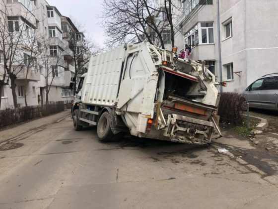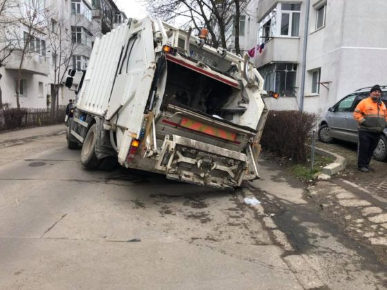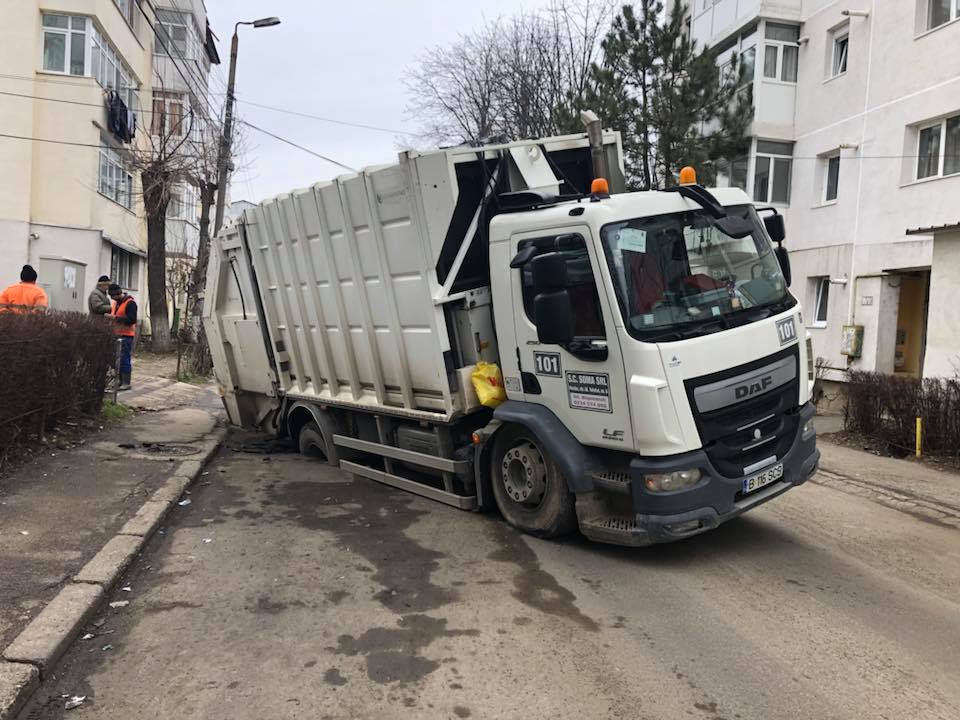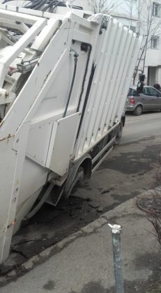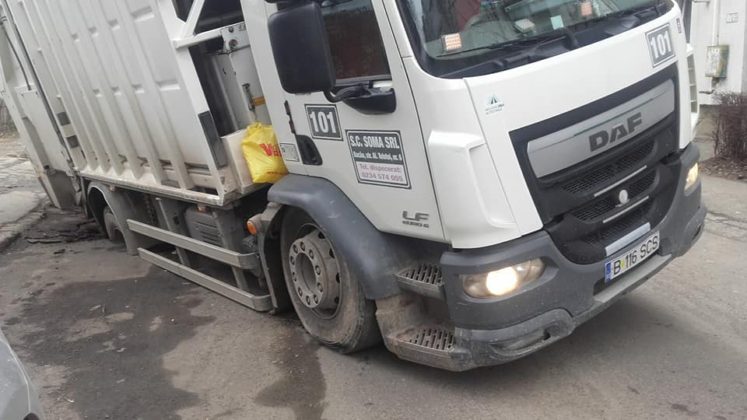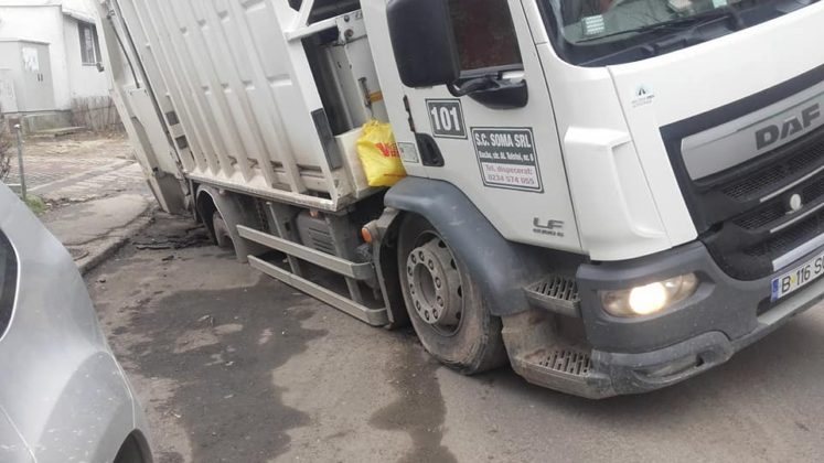 Maşină de gunoi blocată pe stradă după ce s-a surpat asfaltul