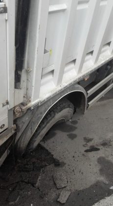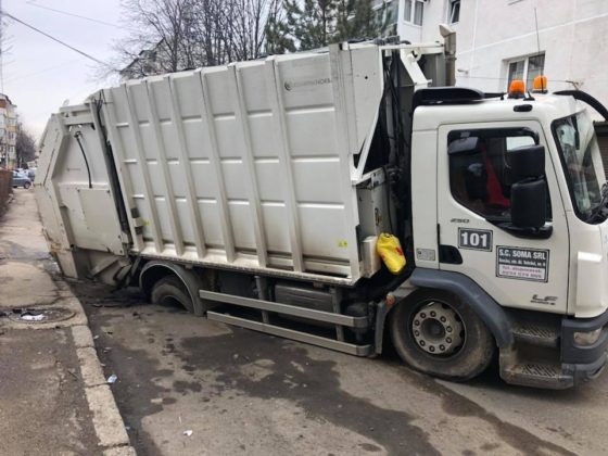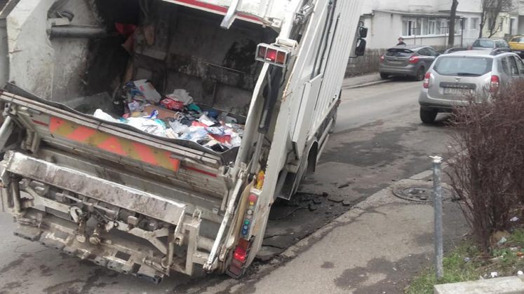 S-a întâmplat astăzi, la prânz, pe strada Bicaz, din municipiul Bacău. Asfaltul s-a surpat sub greutatea unei maşini de gunoi, condusă de un bărbat de 47 de ani, iar autovehiculul a rămas cu o roată din spate blocată în groapa formată.