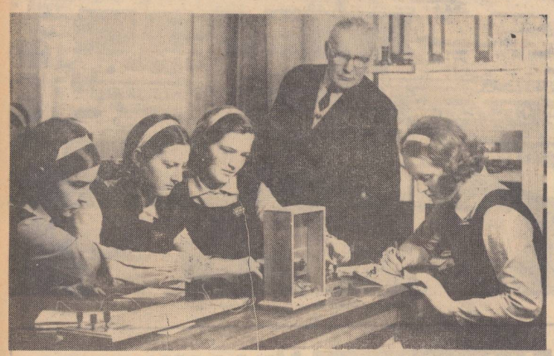 În centrul cadrului se află masa de lucru – robustă, din lemn masiv, pe care sunt așezate instrumente specifice laboratorului: un aparat protejat de o carcasă de sticlă, caiete deschise, un toc cu cerneală. Elevele, îmbrăcate în uniforme bleumarin cu gulere albe și bentițe asortate, lucrează concentrat, notând observații și urmărind cu atenție indicațiile. Atitudinea lor exprimă seriozitate și implicare; nimic nu este teatral, nimic nu pare regizat. Totul sugerează o „obișnuită oră”, așa cum preciza explicația din ziar.