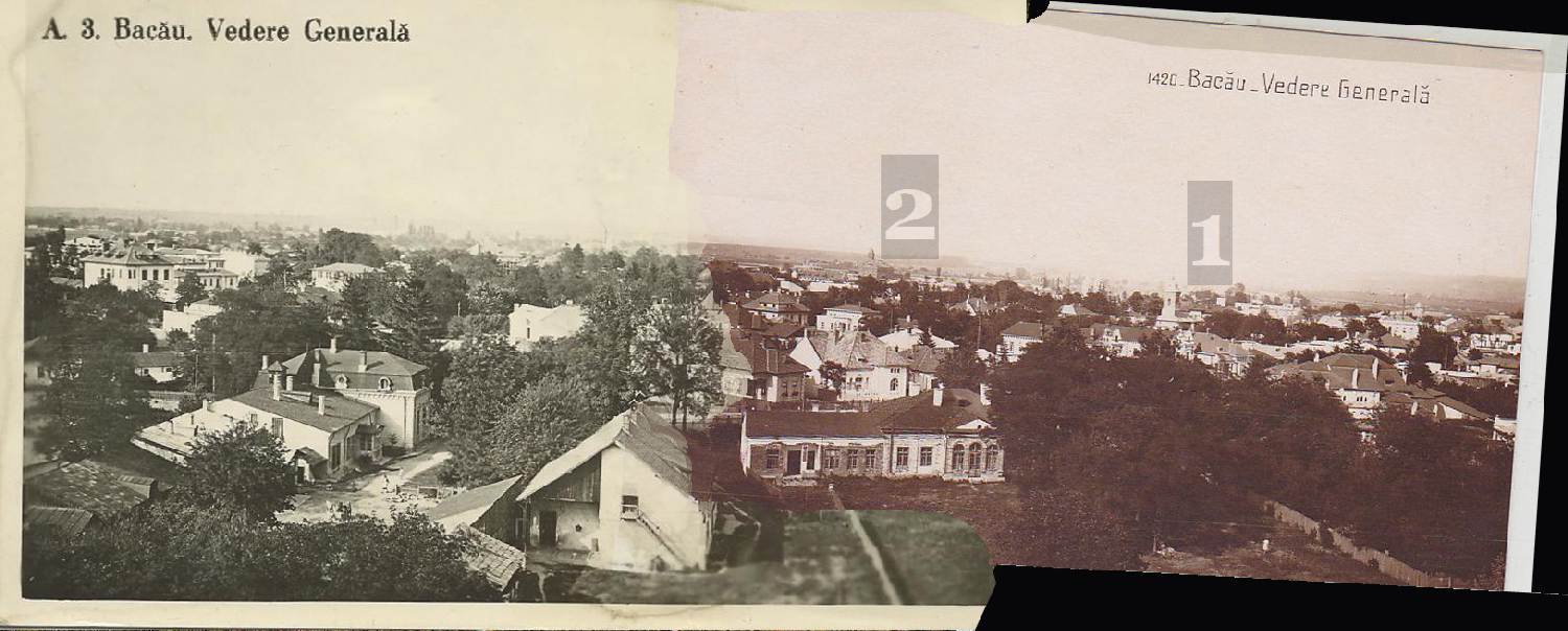 Am folosit două cărți poștale, provenite din surse diferite, pentru a crea o panoramă a Bacăului de la 1942.