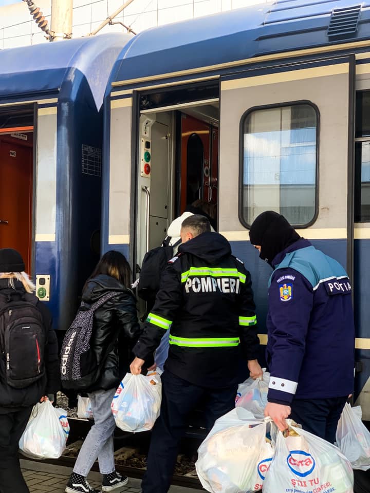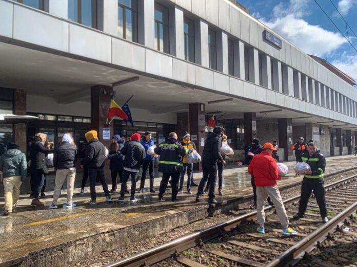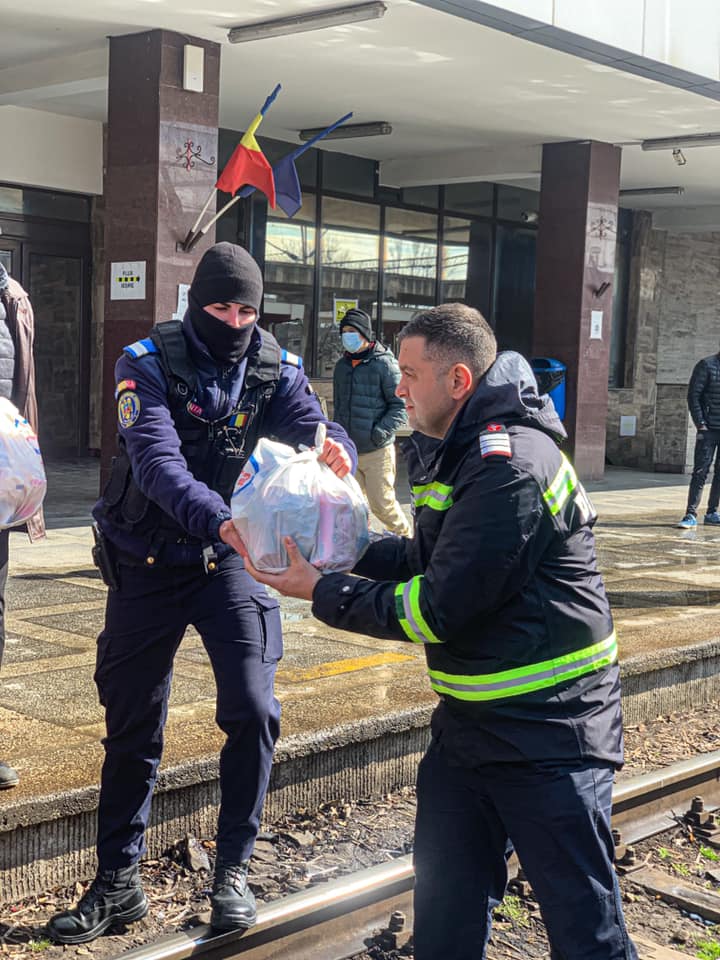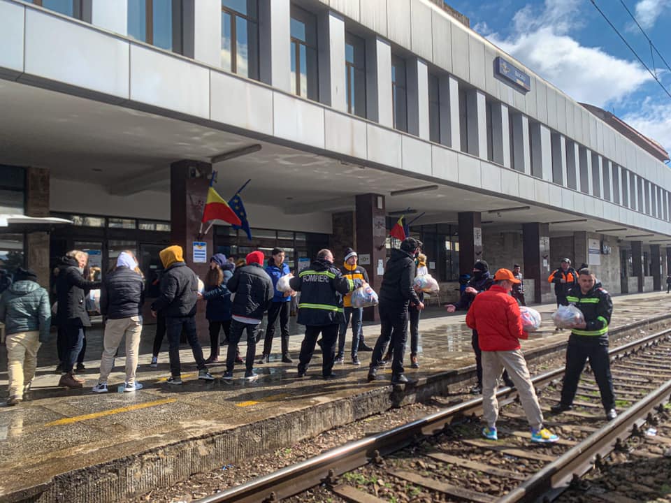 Astăzi, o parte din ajutoarele umanitare colectate la Centrul de Afaceri și Expoziții (122 de pachete) au fost distribuite chiar pe peronul gării, cetățenilor refugiați care au trecut prin orașul nostru.