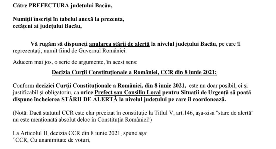 Semnatarii petiției susțin că, în conformitate cu decizia CCR din 8 iunie 2021, „este nu doar posibil, ci și justificabil și obligatoriu, ca orice Prefect sau Consiliu Local pentru Situații de Urgență să poată dispune încheierea STĂRII DE ALERTĂ la nivelul județului pe care îl coordonează”.