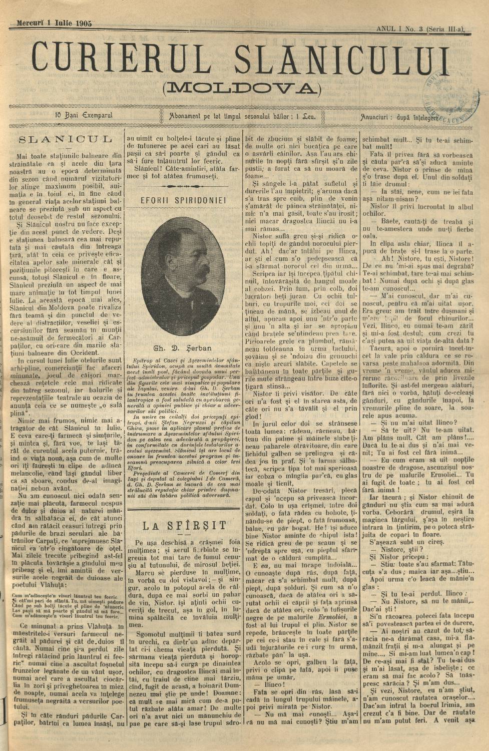 În acest episod: Ziarul ,,Curierul Slănicului Moldovei”, Nr. 3 (Seria a III-a), Miercuri, 1 iulie 1905. Din sumar: Nimic mai atrăgător decât Slănicul în luna lui iulie, supranumit și ,,Paradisul Moldovei”; aflat în vizită la Slănic-Moldova, marele prozator Mihail Sadoveanu publică, în premieră, una dintre povestirile sale, unică în peisajul literar românesc; sunt publicate, tot în premieră, două poezii dintr-un volum tipărit în același an la München, de poetul Isidor Budu, dar și câteva versuri ale poetului Raul Stavri dedicate ,,unei frumoaase din Slănic”; la teatrul din Slănic, va evolua o trupă de comedie a Teatrului Național din Iași; noua direcție a ziarului aduce o serie de îmbunătățiri și angajează un artist-fotograf pentru a prezenta diverse imagini realizate în stațiune; ministrul de Justiție, A. Bădărău, își stabilește reședința de vară la Slănic, la Hotelul ,,Cerbu”; se pregătește primul concurs de frumusețe, în care va fi aleasă ,,Regina Slănicului”;.