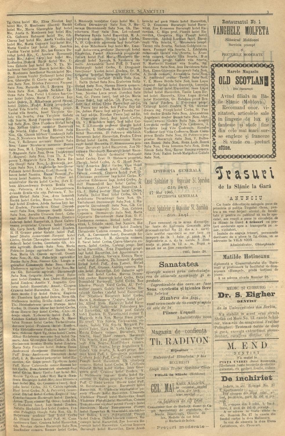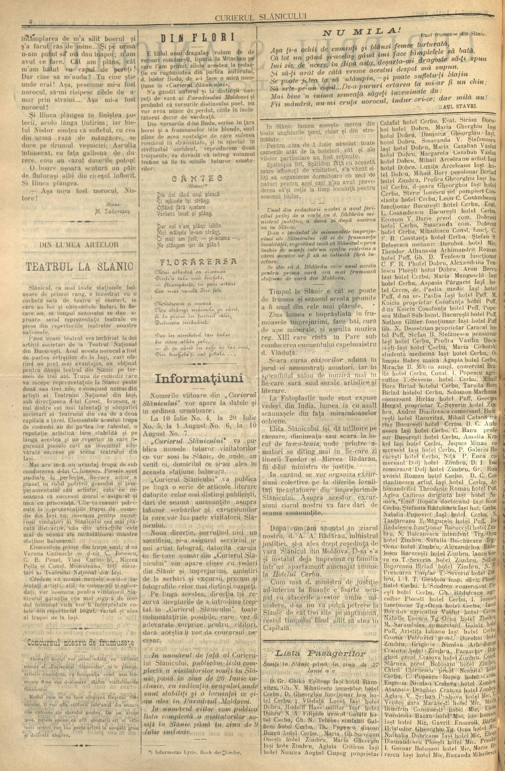 Încă o mostră de promovare a Băilor Slănic-Moldova este oferită și în acest număr, în editorialul intitulat ,,Slănicul”: ,,Deși e stațiunea balneară cea mai reputată și mai căutată din întreaga țară, atât în ceea ce privește eficacitatea apelor sale minerale cât și a poziției pitorești în care este ascunsă, totuși Slănicul e în floare și prezintă un aspect de mai mare animație, în special, în timpul lunii iulie. La această epocă (în această perioadă, n. a.), mai ales, Slănicul din Moldova poate rivaliza fără teamă și din punctul de vedere al distracțiilor, veseliei și excursiilor fără seamăn în munții neasemuit de fermecători ai Carpaților, cu oricare dintre marile stațiuni balneare din Occident. În cursul lunii iulie hotelurile sunt arhipline, comercianții fac afaceri minunate, jocul de căișori marchează rețetele cele mai ridicate din întreg sezonul, iar balurile și reprezentațiile teatrale au ocazia de a anunța ceea ce se numește `o sală plină`. Nimic mai frumos, nimic mai atrăgător decât Slănicul în iulie. E ceva care-ți farmecă și simțurile și mintea și, fără voie, te lași târât de curentul acela puternic, trăind o viață nouă, așa cum de multe ori îți făurești în clipe de adâncă melancolie, când lași gândul ca să zboare, condus de-al imaginației nebun avânt”.