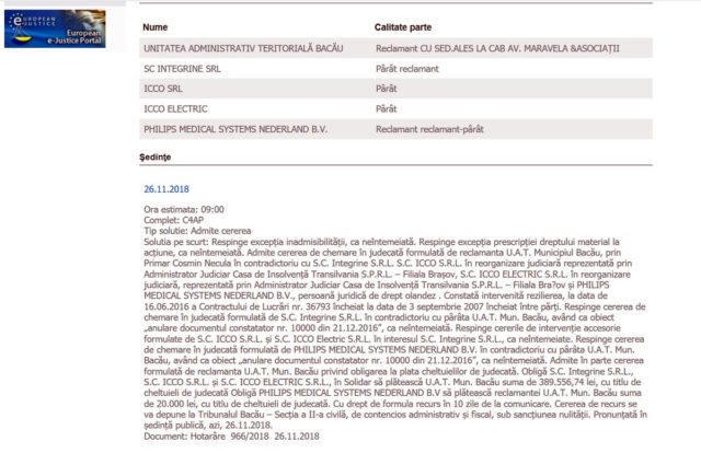 Instanța a respins cererile formulate de Integrine și Philips vizând anularea documentului din data de 21 decembrie 2016 și a dispus obligarea membrilor Consorțiului la plata către UAT Bacău a sumei de 389.556 de lei, cu titlu de cheltuieli de judecată.