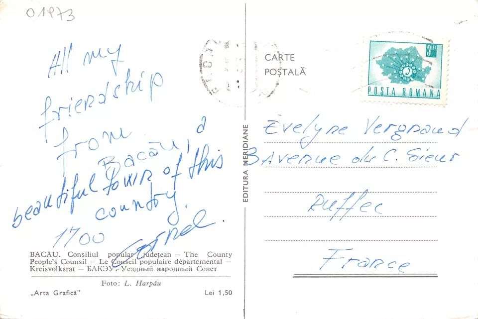 Cartea poștală prezentată surprinde Palatul Administrativ din Bacău, un edificiu remarcabil al orașului, care a servit de-a lungul timpului drept sediu al autorităților locale. Aceasta a fost trimisă în Franța la sfârșitul anilor ’70, o perioadă în care România se afla sub regimul comunist, iar comunicarea internațională prin intermediul corespondenței era una dintre puținele modalități prin care oamenii puteau menține legătura cu cei dragi aflați peste hotare.