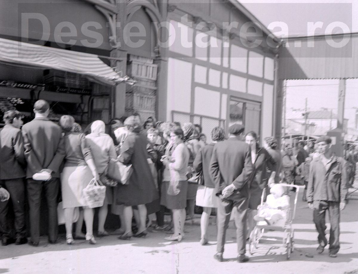 Fotografia surprinde aglomerația tipică piețelor din acea perioadă. Grupuri de oameni, majoritatea femei, stau aliniați în fața unei tarabe, probabil în așteptarea de a cumpăra produse rare, cum ar fi carne, ouă sau legume. Această imagine reflectă, totodată, și provocările vremii – lipsa unor produse de bază și nevoia de a sta la cozi interminabile.