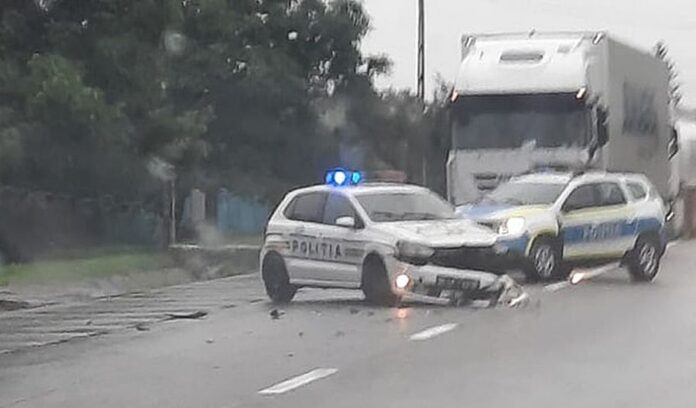 O autoutilitară de poliție a fost avariată, azi-dimineață, după ce a fost lovita de un autoturism condus de o femeie de 50 de ani.
