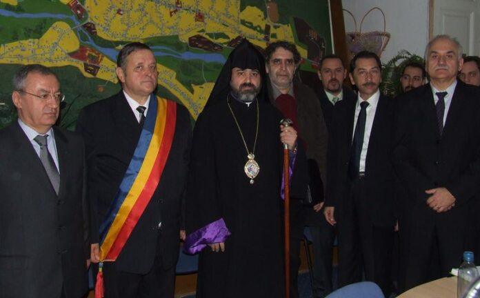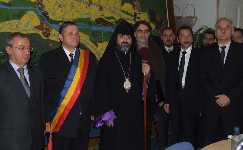 Cu glasuri calde de copii, care le-au urat bun venit, asa au fost intâmpinati oaspetii armeni care s-au aflat in cursul zilei de duminica, 18 noiembrie, in orasul-statiune Târgu Ocna. Ambasadorul Armeniei in România, Hamlet Gasparian, P.S. Datev Hagopian, Intâistatatorul Bisericii Armene in tara noastra, Varujan Pambuccian, liderul grupului minoritatilor din Parlamentul României, scriitorul Vartan Arachelian si alte oficialitati armene s-au aflat in rândul oaspetilor care au poposit in orasul de la poalele Magurii, ei fiind intâmpinati, la Primaria Târgu Ocna, de catre edilul-sef Stefan Silochi si de viceprimarul Marcel David. La aceasta intâlnire a participat Dan Tataru, secretar de stat pentru relatia cu Parlamentul, informare publica si cresterea calitatii vietii personalului la Ministerul Apararii Nationale, reprezentanti ai comunitatii armene din Bacau si Botosani si alti invitati. Intr-o intrevedere care a avut loc la sala de sedinte a Consiliului Local Târgu Ocna, primarul Stefan Silochi a declarat ca „fata de comunitatatea armeana si de tot ce a realizat aceasta in localitate, exista un respect deosebit si vom sprijini toate actiunile pentru o colaborare fructuoasa”. Arhimandritul Datev Hagopian, Episcopul tuturor armenilor din România a reliefat faptul ca „populatia armeana are o istorie de peste 100 de ani pe pamântul României, fapt ce a facut ca in decursul vremii armenii au amestecat cu acest pamânt toate trairile lor si aceasta tara a devenit patria lor. Aici ma simt ca acasa, in România fiind doua manastiri si 14 biserici armene. Una din aceste frumoase biserici se gaseste la Târgu Ocna, lânga ea fiind si Cimitirul armenesc. Dorinta noastra este de a reusi sa reparam aceasta biserica, in România fiind reparate câteva biserici armenesti si acest lucru se simte in rândul credinciosilor. In planurile noastre se afla pe primul loc repararea Bisericii Armene din Târgu Ocna si dorim sa aducem o cruce-monument. Aceasta cruce am vrea sa fie amplasata la Cimitirul Ostasilor Sovietici din Tg. Ocna, unde este ingropat un maior armean, care a murit in luptele de pe aceste meleaguri. Dorim sa cream o legatura frateasca si calda intre Armenia si acest oras. Când aveti drum prin Armenia sa ne pasiti pragul pentru ca puteti veni ca acasa. Il rog pe bunul Dumnezeu ca orasul Târgu Ocna sa nu fie atins de criza mondiala si in rugaciunile noastre se afla si dorinta ca acest oras sa aiba un viitor frumos”.