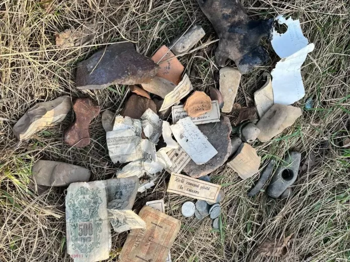 Printre obiectele descoperite se numără monede vechi, fragmente de bancnote ieșite din uz, etichete descriptive pentru unele dintre obiectele descoperite, înscrisuri și fragmente din piese arheologice.