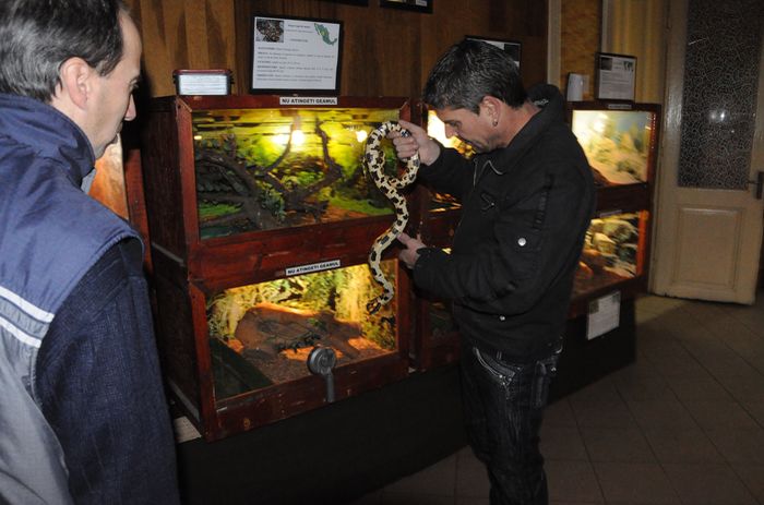 Florin Sârb este cel mai important colectionar de reptile exotice din România. Incepând din aceasta saptamâna, expozitia sa e gazduita de Vivariul din cadrul Muzeului de Stiintele Naturii „Ion Borcea”. Colectia cuprinde peste 70 de specii de serpi, sopârle si testoase din Asia, Africa, America, Europa si Australia. Sunt si cinci terarii in care dormiteaza tarantule adulte, pufoase ca niste scaieti, si unul in care cresc patru pui de tarantula. Florin Sârb este interesat de reptile din copilarie, când prindea sopârle pentru a se juca cu ele, insa, odata cu trecerea anilor, pasiunea s-a transformat in ceva foarte serios, mai exact in ocupatia sa de baza. Chiar daca e o munca periculoasa, iar veniturile pe care i le aduce nu sunt foarte mari, nu poate renunta. E vorba de pasiune si de satisfactia de a fi cel mai bun. „De când eram copil adunam serpi si sopârle si le aduceam acasa, marturiseste Florin. Cu timpul a devenit o pasiune. Dupa Revolutie, am inceput sa merg la târgurile internationale din Germania si Ungaria, unde am vazut colectii importante si de unde am cumparat exemplare valoroase.” Uneori, e nevoit sa faca din timp comanda pentru ca furnizorul sa aduca un sarpe de pe alt continent, special pentru el. „Am adunat la un moment dat 120 de reptile, apoi am ramas cu 70”, explica Florin. A renuntat la o parte dintre ele pentru ca sunt foarte greu de ingrijit si e nevoie de mult spatiu pentru a amplasa terariile. La ora asta, cele mai spectaculoase exemplare sunt Taipanul, care este cel mai veninos sarpe de pe glob, Mamba negru si Mamba verde, cei mai veninosi din Africa, Vipera de Gabon, Anaconda galbena si Boa curcubeu. Alte reptile interesante ale expozitiei de la Muzeul „Ion Borcea” sunt vipera Jararaca, sopârla Gecko, Testoasa aligator. Florin Sârb a organizat expozitii in toate orasele mari din tara si in fiecare a stat o luna – o luna si jumatate, in functie de conditiile asigurate de partener. In România sunt doar trei colectionari care sunt in stare sa organizeze expozitii de reptile exotice, iar Florin Sârb este cel mai reprezentativ dintre acestia. Expozitia lui va ramâne la Vivariul din Bacau pâna pe 3 februarie 2013.