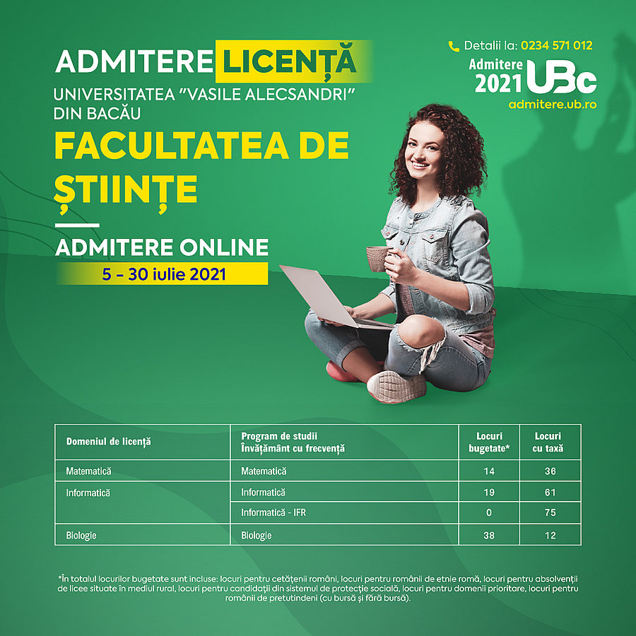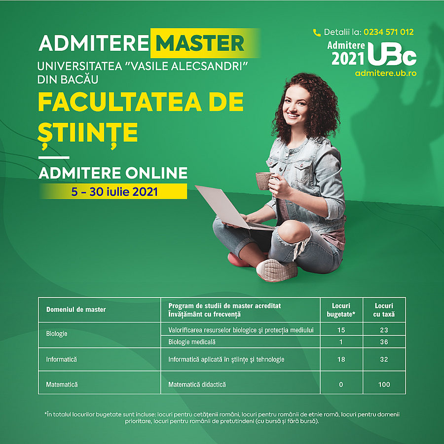 Facultatea de Științe a Universității „Vasile Alecsandri” din Bacău organizează, pentru anul universitar 2021-2022, admitere la ciclurile de studii universitare de licență și master, programe postuniversitare de conversie profesională și programe de formare psihopedagogică, nivelul I și II.
