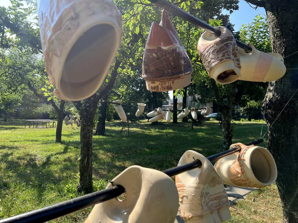 „Grădina cu statui” cuprinde lucrări semnate de cunoscuți autori atât din țară, cât și din străinătate, fiind rezultatul Taberelor/Simpozioanelor internaționale de sculptură „George Apostu” (1991-1998; edițiile I-VIII) și a celor trei ediții de Rezidențe „Albastru” (2017-2019). În plus, ansamblul artistic include și operele ceramice din seria „Muguri”, create de talentatul artist plastic Ovidiu Ionescu.