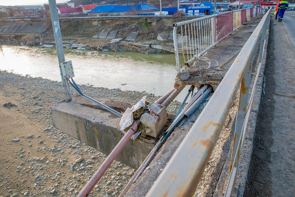 Starea critică a podului rutier peste Trotuș de la Onești se agravează cu fiecare clipă. În urma cu două zile, s-a desprins o parte a balustradei antrenând în cădere atât conductele, cât și cablurile ce traversau podul. S-a rupt și a căzut, cu tot cu gardul de protecție, și o bucată mare din trotuarul deja deteriorat. Situația este cu atât mai dramatică, pentru că vorbim de un pod circulat zilnic de mii de mașini și oameni. Singura măsură de urgență luată a fost amplasarea unui indicator rutier de interzicere a circulației pentru camioanele de tonaj greu.