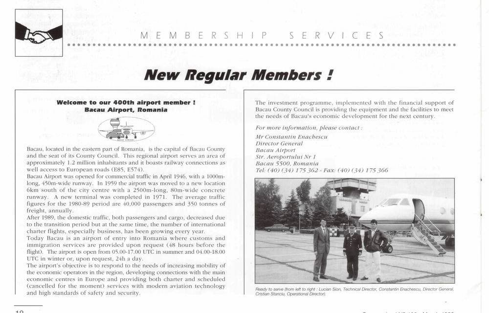 – in 1999, Aeroportul Bacau a devenit membru al ACI – Europe (vezi foto).
