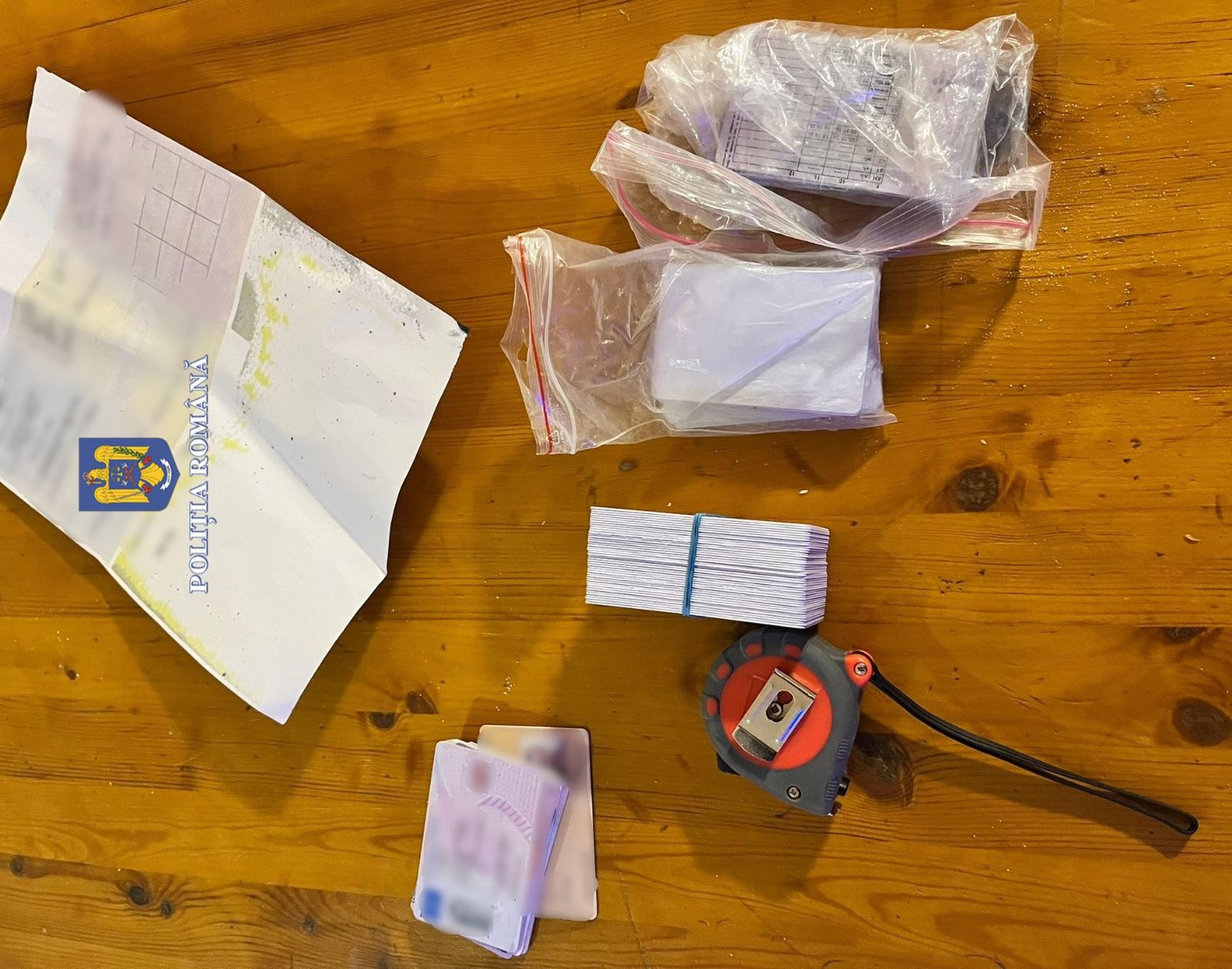 Perchezițiile au adus la iveală o adevărată fabrică de documente false. Printre acestea se numără permise de conducere, cărți de identitate, polițe de asigurare obligatorie auto, certificate de înmatriculare auto și acte de studii. Mai mult decât atât, polițiștii au descoperit și mai multe sisteme informatice sofisticate folosite pentru falsificarea acestor înscrisuri.