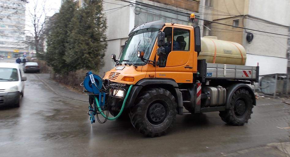 Intre timp, autoutilitara a intrat pe stradutele acoperite cu gheata si au dat cu solutie inclusiv in spatele blocurilor. Masina a intrat inclusiv pe strazile Castanilor, Garofitei si Carpati.