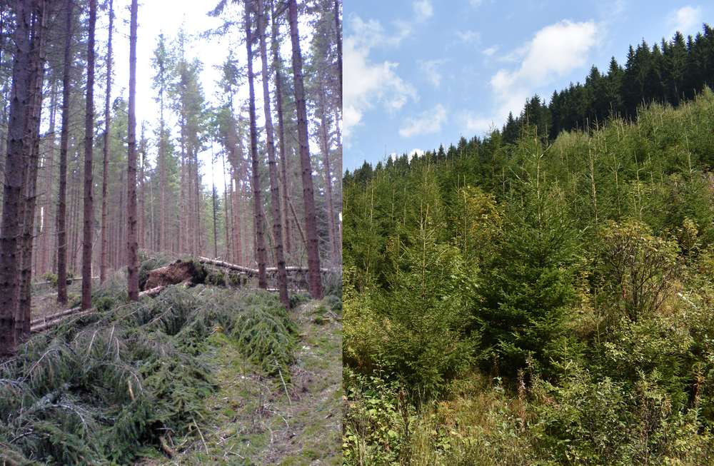 „Acum peste șapte ani – am aflat de la ghidul meu de ocazie, inginerul Ionel Dumitru de la Direcția Silvică Bacău -, au fost afectate arboretele tinere de molid cu vârste de 40-60 de ani de pe o suprafață totală de 237 ha, în general din jumătatea inferioară a versanților. Pe lângă arborii doborâți s-au rupt vârfurile arborilor de molid de la 2-4 m, fapt care a condus la debilitarea și degradarea arboretelor afectate. Speciile de rășinoase și în special molidul au tulpini monopodiale, ceea ce înseamnă cu un singur ax cu un mugure terminal la vârf. Ruperea vârfului conduce la debilitarea arborelui și la scăderea capacităților ecologice, ceea ce duce într-un interval de timp relativ la uscare”.