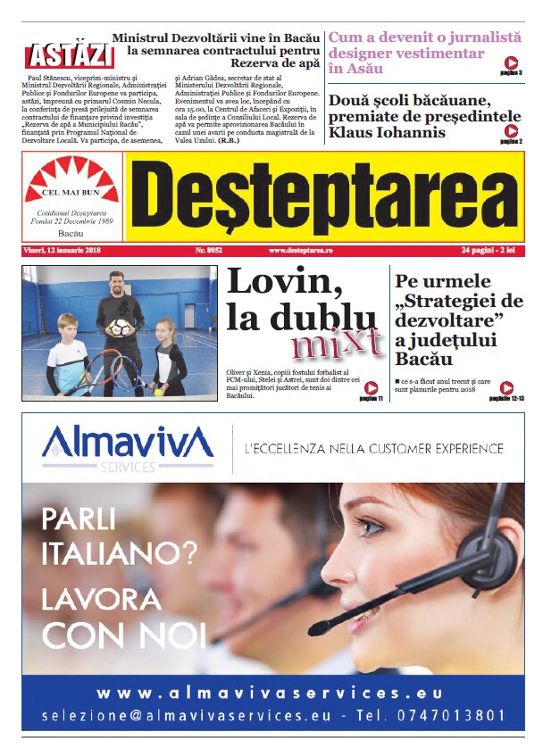 pag 1 Deșteptarea 12 ianuarie 2018 Acțiune FacebookTwitterWhatsAppTelegramVK Acțiune FacebookTwitterWhatsAppTelegramVK A7 Moldova: Lucrări avansate la trecerea Berești-Sascut, aproape de finalizare „Retorta de argint” și alte lumi dispărute: amintiri despre festivalurile muncitorești Bacăul accelerează în topul salarial al Moldovei: industria trage județul înainte Box: ACS Dan Gym Box, clubul de bronz cu oameni de aur Guvernul limitează cantitățile de alcool și tutun pentru uz personal: maximum 10 litri de băuturi spirtoase Scos din trafic de polițiștii rutieri și introdus în arest Exercițiu de evacuare și prim ajutor la Spitalul Județean de Urgență Bacău, simulând un cutremur în zona Vrancea Spitalul „Prof. Dr. Eduard Apetrei” Buhuși deschide dialogul cu pacienții, într-o întâlnire programată pe 23 decembrie Două dintre cele mai valoroase companii din România sunt din Bacău, conform Ziarului Financiar Bacău: Universitatea „Vasile Alecsandri” a organizat serbarea de Crăciun Dublă lansare de carte la Centrul de Cultură „George Apostu”, cu Carmen Mihalache și Dan Perșa Creștere a infecțiilor respiratorii în județul Bacău. Opt cazuri noi de gripă în ultima săptămână