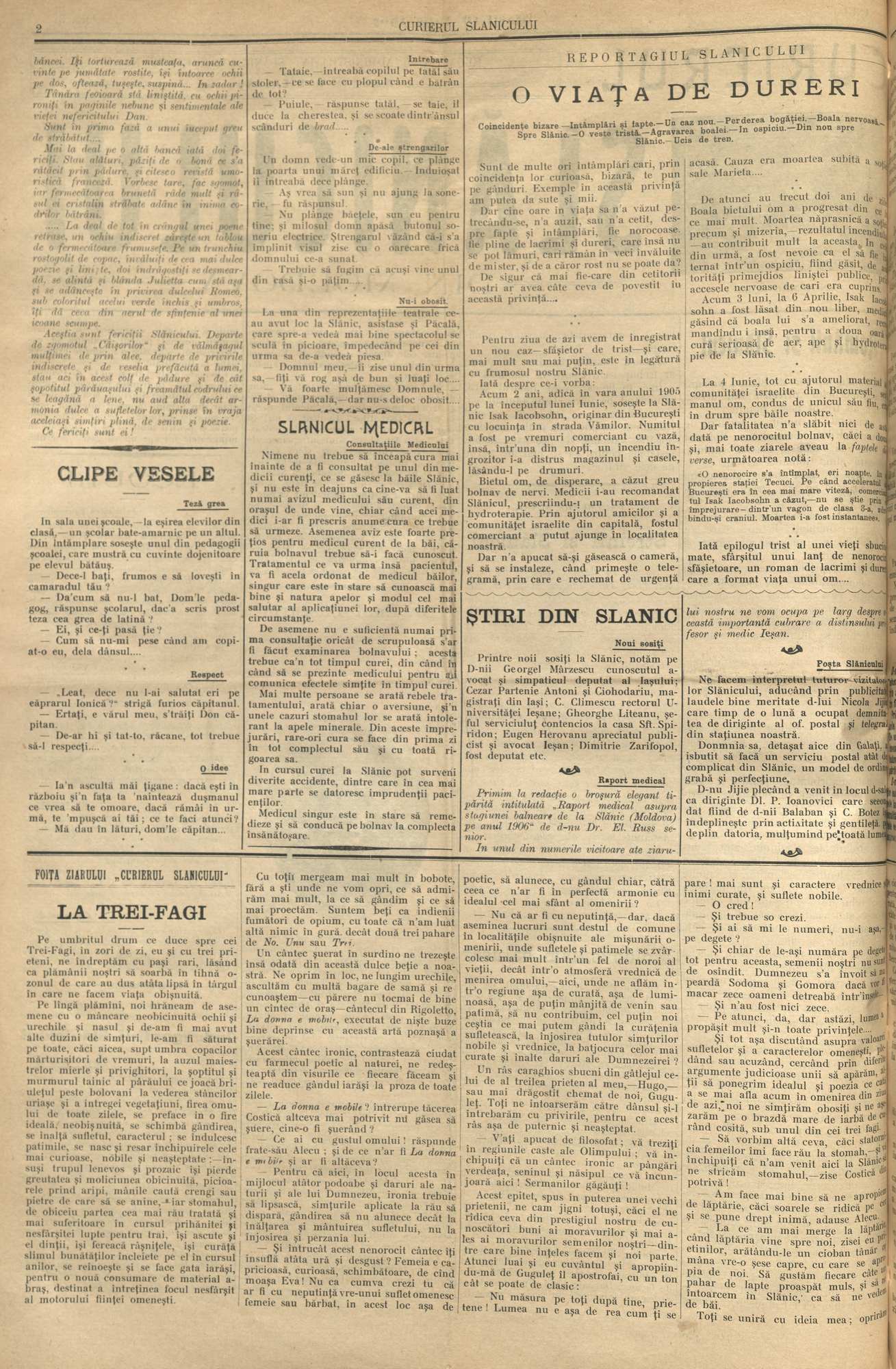 În ,,Reportajul Slănicului”, cu titlul ,,O viață de dureri” este prezentat un caz cu final tragic, într-o oarecare legătură cu Slănicul: În urmă cu vreo doi ani a sosit în stațiune, un evreu român, originar din București, unde pe vremuri fusese un comerciant de vază, dar care, în urma unui incendiu care i-a distrus magazinul și casele, a rămas pe drumuri. Bietul om a căzut greu bolnav de nervi și medicul i-a recomandat să facă hidroterapie la Slănic-Moldova, acolo unde reușește să ajungă cu ajutorul amicilor. Dar nici nu a apucat bine să se instaleze în camera de hotel, când primește o telegramă în care este anunțat de moartea subită a soției sale, Marieta!