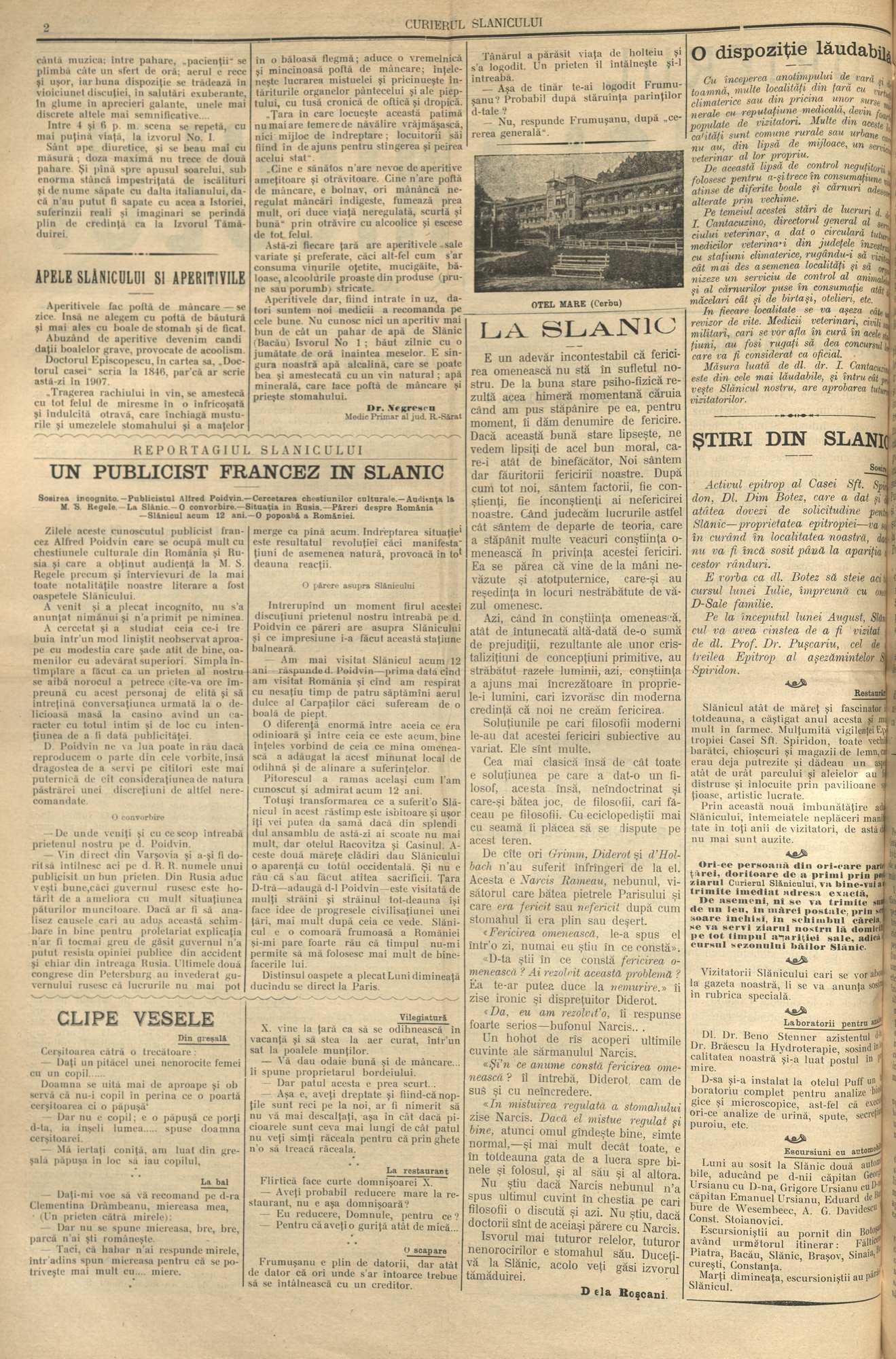 ,,Reportajul Slănicului” relatează în acest număr vizita incognito a unui cunoscut publicist francez al epocii, Alfred Poidvin, care s-a aflat pentru o scurtă perioadă la Băile Slănic. A trecut aproape neobservat, doar întâmplarea a făcut ca un prieten al redacției să petreacă împreună cu acesta câteva ore și să întrețină o conversație, urmată de o masă delicioasă la Cazinou.