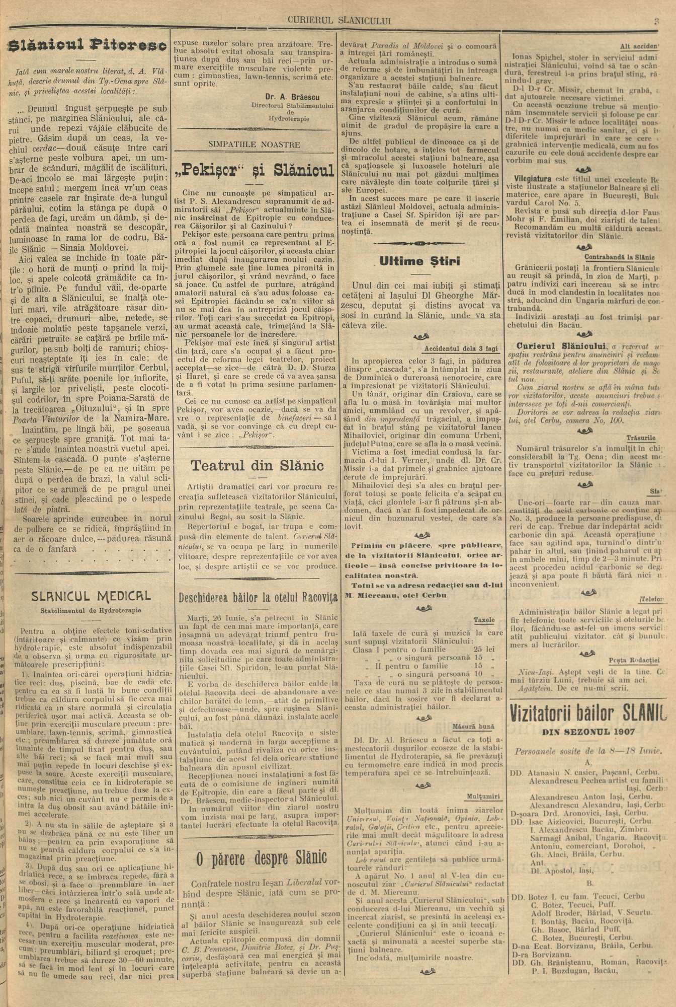 Și în acest număr, prin articolele ,,Măreția Slănicului” și ,,Slănicul și Sinaia” (acesta din urmă a mai fost prezentat într-un alt număr al ziarului), redacția continuă promovarea stațiunii Slănic-Moldova, prin prezentarea atuurilor sale, în permanentă comparație cu Sinaia, stațiune avantajată de investițiile familiei regale a României care și-a stabilit aici, încă de prin 1864, reședința sa de vară (construind complexul castelului ,,Peleș”) și unde aceasta ,,cheltuiește câteva milioane pe an, iar personalitățile politice și din elită, trebuie și ele să cheltuiască, volens – nolens, contribuind astfel, la succesul și înfrumusețarea ei”. În timp ce la Slănic, singurul și cel mai important investitor rămâne Epitropia Spitalului ,,Sf. Spiridon” din Iași, administratorul stațiunii.