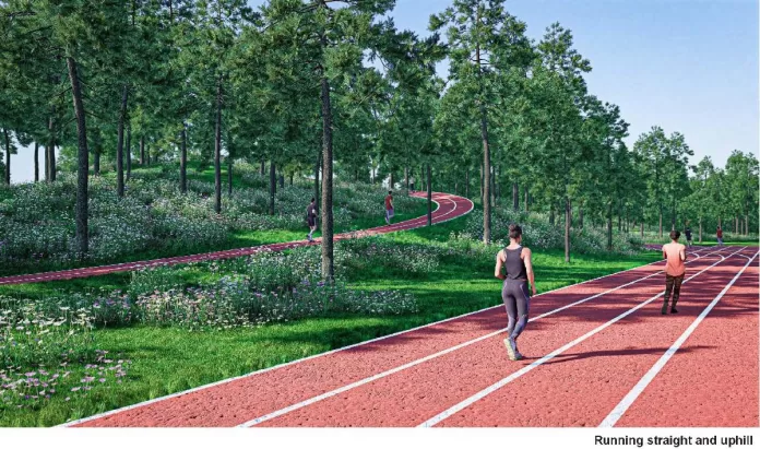 Așa cum s-a dorit, „Athletic Park” va fi o oază de verdeață, cu copaci, dar și cu un lac în zona centrală. El îmbină în mod inspirat zonele de promenadă, recreere și socializare cu multitudinea de spații pentru diferite discipline sportive: piste de alergare pe teren plan și variat (aceasta din urmă va urca și va coborî dealul pe un traseu cu două culoare și va sfârși într-o centrifugă), un teren de baschet, unul de volei pe plajă amplasat pe nisipul de lângă lac, zonă pentru sărituri, zonă pentru aruncări etc. Nu lipsesc nici spațiile interioare, care includ și un tunel de acces pentru a face legătura cu terenul de aruncări ce va fi împrejmuit cu un gard înalt pentru evitarea accidentelor.