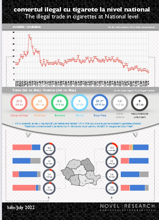 „În luna iulie, piața neagră a scăzut la nivel național cu 1 p.p. De remarcat scăderea semnificativă a comerțului ilicit în partea de nord-est a țării, cu 13,4 p.p. față de mai, până la 13,3%, cel mai mic procent înregistrat în această zonă, cu toate că regiunea este în continuare cea mai afectată de contrabandă. Pe de altă parte, în regiunea sud-est piața neagră a crescut cu 3,9 p.p. până la 7,2%. Din punct de vedere al provenienței produselor de pe piața neagră, țigaretele etichetate ca fiind destinate Duty Free dețin cea mai mare pondere, de peste 50%, surclasând „cheap whites”, care au reprezentat până acum principala sursă”, a declarat Marian Marcu, Director General Novel Research. „Contrabanda a atins un minim istoric de 6,1% din totalul pieței de tutun, un rezultat al eforturilor continue ale autorităților de aplicare a legii. Cu toate acestea, traficul ilicit continuă să reprezinte un risc serios la adresa dezvoltării economice și a siguranței comunităților. În primul rând, contrabandiștii își diversifică în continuu metodele. Astfel, potrivit Europol, în Uniunea Europeană există peste 5.000 de grupări de crimă organizată specializate în operațiuni transfrontaliere coordonate online. În al doilea rând, în România s-a intensificat activitatea de contrafacere: doar în 2022 au fost identificate și închise cinci fabrici ilegale de produse din tutun de pe teritoriul țării. De aceea, dincolo de bine-venitele modificări recente ale Codului Fiscal, prin care a fost creat un calendar de creștere predictibilă a accizelor pentru toate categoriile de produse din tutun, este nevoie ca autoritățile să acorde o atenție sporită și noilor forme de contrabandă. Pe fondul reducerii pieţei negre, BAT a plătit la bugetul de stat în 2021 cu circa 1,25 miliarde de lei mai mult faţă de anul precedent, ajungând la circa 11 miliarde de lei contribuţii prin accize şi taxe”, a declarat Ileana Dumitru, Director juridic și relații publice al Ariei Europa Centrală și de Sud în cadrul BAT. „Novel înregistrează un minim al contrabandei, dar și schimbări semnificative în structura provenienței țigaretelor de pe piața neagră. Creșterea ponderii produselor tip Duty Free, din care o treime reprezintă produse destinate magazinelor din Republica Moldova, arată că este necesară o cooperare mai strânsă a autorităților de aplicare a legii din România cu cele din țările vecine și un cadru legislativ anti-contrabandă unitar în regiune. JTI va continua să sprijine autoritățile în activitățile pe care le desfășoară pentru combaterea comerțului ilicit. Recent, JTI și Poliția de Frontieră au reînnoit Protocolul de colaborare semnat în 2013, prin care sunt prevăzute suport logistic, expertiză și traininguri specifice pentru identificarea produselor contrafăcute, pe baza elementelor de siguranță ale mărcilor. JTI va continua colaborarea constructivă cu celelalte autorități de aplicare a legii, precum și campaniile publice anti-contrabandă derulate anual din 2010, în parteneriat cu Vama, Poliția de Frontieră și Poliția”, a declarat Gilda Lazăr, Director Corporate Affairs & Communications JTI România, Moldova și Bulgaria.