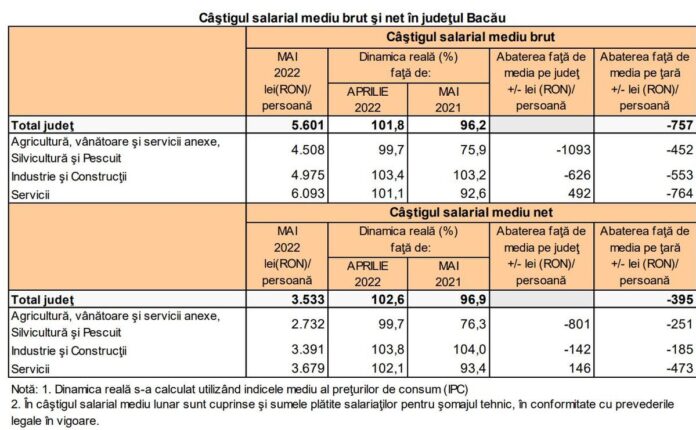 Conform Direcției Județene de Statistică, în luna mai 2022 câştigul salarial mediu brut a fost în judeţul Bacău de 5.601 lei (RON)/persoană, cu 757 lei (RON)/persoană mai mic decât cel înregistrat la nivelul economiei naţionale (-11,9%).