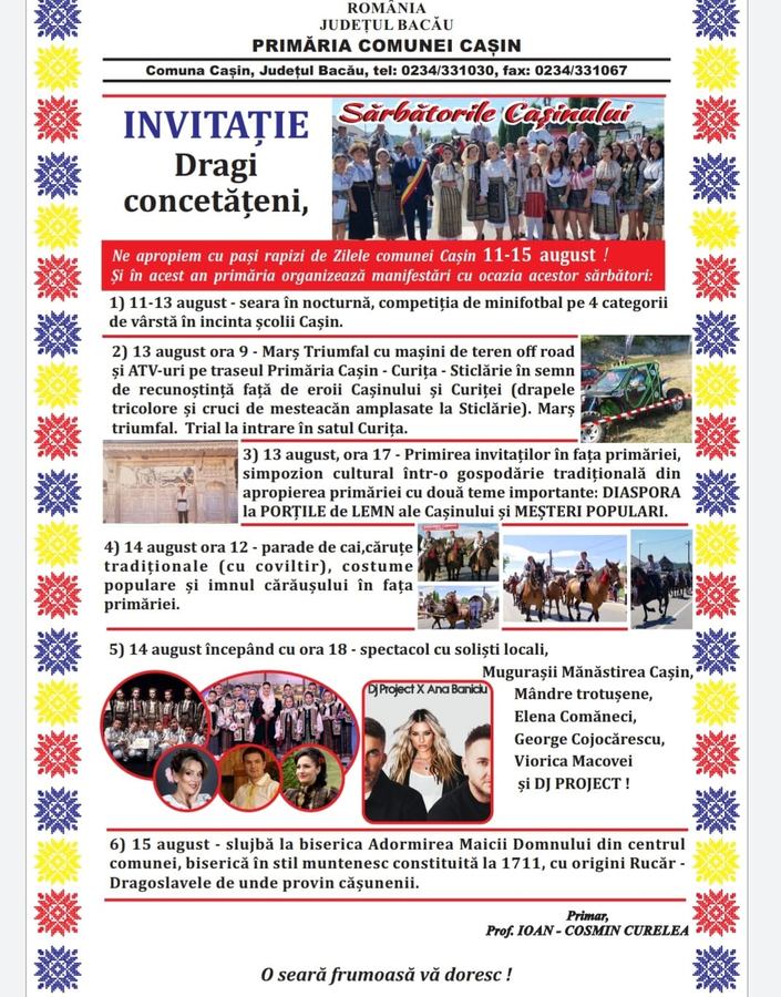Principalul eveniment al programului „Sărbătorile Cașinului” – spune primarul Ioan-Cosmin Curelea – va fi, în acest an Simpozionul organizat pe 13 august, de la ora 17,00, într-o gospodărie tradițională, pe temele „Diaspora la Porțile de lemn ale Cașinului” și „Meșteri populari”. În aceeași zi, însă, de la ora 9,00 va avea loc un marș triumfal cu mașini off-road și ATV-uri pe traseul Primărie-Curița-Sticlărie, pentru cinstirea memoriei eroilor care au luptat pe aceste meleaguri în Primul Război Mondial.