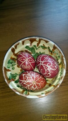 La încondeierea ouălor, în funcție de zonă, femeile satului folosesc mai multe culori, fiecare dintre ele având un anume simbol. Bunăoară, albul este simbolul purității, roșul semnifică viața (indicând culoarea sângelui), albastrul reprezintă cerul și apa, iar negrul, fertilitatea, în vreme ce galbenul te duce cu gândul la soare și aur, liniile pictate pe ouă simbolizând eternitatea. În trecut, bătrânii vopseau ouăle în culori vegetale, obținute după rețete străvechi. Pe cale naturală, se obțineau doar cinci culori, cu nuanțe diferite: galben, verde, roșu, albastru și negru. De exemplu, culoarea roșie se obținea din coaja de măr dulce, frunze și flori de măr dulce, flori de sovârf sau coajă de maceșe, în vreme ce albastrul se obținea din flori de viorele, iar galbenul, din coji de ceapă, coajă de lemn pădureț ori coajă de „lemnul câinelui”. Frunzele de nuc erau folosite pentru obținerea verdelui, iar coaja verde a nucilor, pentru negru. Cert e că modelul ouălor încondeiate se diferențiază în funcție de localitate, motiv pentru care, în prezent, se găsesc o multitudine de variante, cele mai simple fiind ,,Floarea Paștelui”, „Creasta cocoșului” sau ,,Oala legată”. Mai complicate sunt „Crucea Paștelui”, spicul de grâu, albina, „Calea rătăcită” sau alte motive religioase, florale, fitomorfe și geometrice. Tehnica este una relativ simplă, dar, în același timp, foarte ingenioasă. Astfel, metoda încondeiatului presupune folosirea cerii curate de albine, fierbinte, în care, odinioară, se presăra și un vârf de cuțit de cărbune bine pisat. Mai întâi, ouăle se degresează cu apă şi detergent, după care se fierb, ținându-se apoi la căldură, pentru a se usca. Urmează etapa împodobitului cu diferite modele, folosindu-se chişiţa, un instrument confecționat dintr-un bețigaș de lemn și o pâlnie foarte fină, din alamă, prin care este petrecut un fir de păr de porc. „Cu acest condei, ținut în ceară caldă, se trasează linii și puncte pe ou, astfel încât să obţii modelul dorit. După aceea, introducem oul în boia roșie, unde stă circa 4 – 5 minute, până se obţine culoarea dorită. Neapărat, vopseaua trebuie să fie rece. Iar, la final, îndepărtăm ceara la o sursă de căldură, de regulă, flacăra unei lumânări. Așa apare modelul”, ne explică Viorica Florian.