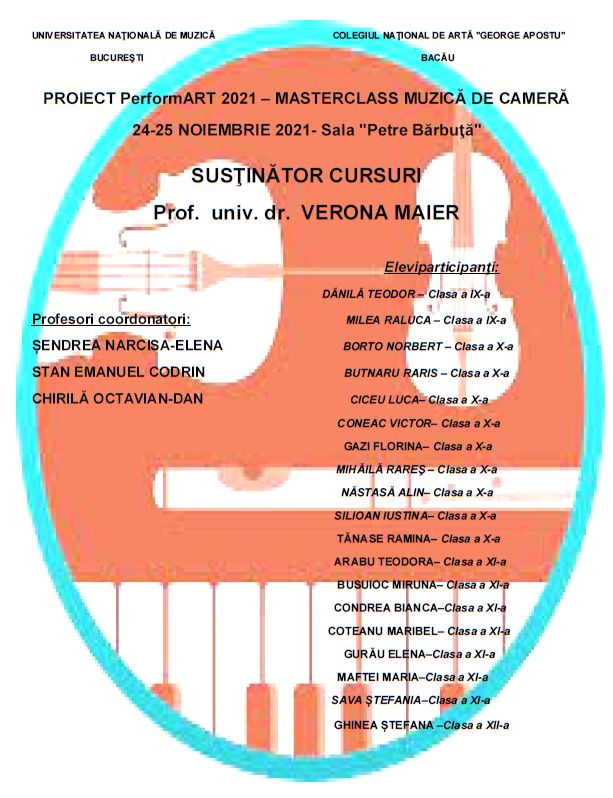 ” În cadrul proiectului ”PERFORMART” derulat în ultimii trei ani de Universitatea Națională de Muzică, grație susținerii Fondului pentru Dezvoltare Instituțională al Ministerului Educației, am vizitat în 24 și 25 noiembrie Colegiul Național de Artă”George Apostu” din Bacău.
