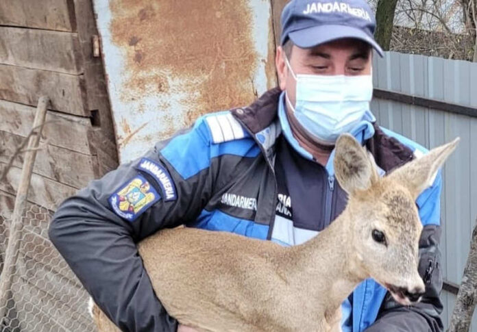 Conform relatărilor persoanei care a solicitat intervenția jandarmilor, puiul de căprioară fusese alergat de niște câini și a reușit să se adăpostească în curte înainte de a fi ajuns din urmă.