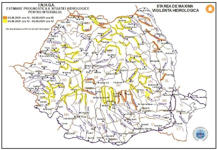 COD GALBEN – în intervalul 05.08.2021, ora 12:00 – 06.08.2021, ora 12:00, pe râurile din bazinele hidrografice: