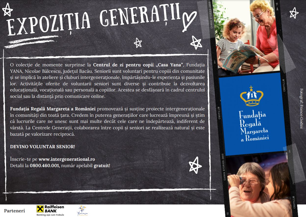 Expoziția Generații va avea loc simultan și în alte 14 localități din țară, acolo unde copiii și seniorii participă la activități intergeneraționale, în scopul susținerii școlare, dar și al dezvoltării vocaționale sau personale, prin finanțarea programului național „Centrele Generații”. Imaginile, emoțiile și relațiile intergeneraționale au fost surprinse în cadrul centrelor de zi de tip școală după școală din comunitate de către doi fotografi pasionați de bine – Ana Călin și Franco Godini.