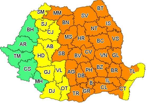 Alături de Capitală, judeţele marcate cu Cod portocaliu sunt Maramureş, Bistriţa-Năsăud, Suceava, Botoşani, Iaşi, Neamţ, Harghita, Mureş, Sibiu, Braşov, Covasna, Bacău, Vaslui, Galaţi, Vrancea, Buzău, Prahova, Dâmboviţa, Argeş, Teleorman, Giurgiu, Ilfov, Călăraşi, Ialomiţa, Brăila, Tulcea (parţial) şi Constanţa (parţial).