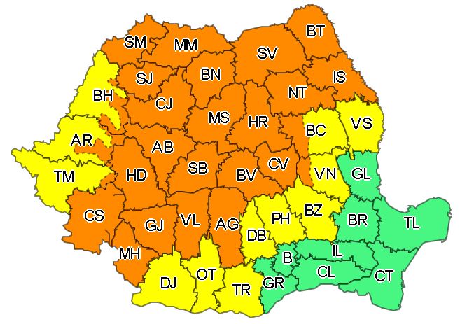De asemenea, începând de miercuri, de la ora 14:00, şi până joi dimineaţa, la ora 6:00, un Cod portocaliu de vijelii puternice, grindină şi ploi abundente vizează zone din 26 de judeţe situate în Transilvania, Maramureş, jumătatea de nord a Moldovei, zonele de munte, sudul Banatului, iar în cursul nopţii şi nordul Olteniei şi nord-vestul Munteniei. Vor fi perioade cu instabilitate atmosferică deosebit de accentuată.