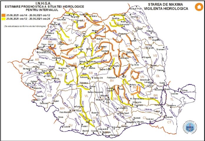 Totodată, în intervalul 25 iunie, ora 12:00 – 26 iunie, ora 24:00, va fi Cod galben pe râurile din bazinele hidrografice Vişeu, Iza, Lăpuş (judeţul Maramureş), Tur (judeţul Satu Mare), Someşul Mare (judeţul Bistriţa Năsăud), Someşul Mic (judeţul Cluj), Someş – afluenţii mici aferenţi sectorului aval S.H. Dej (judeţele: Cluj, Sălaj, Maramureş şi Satu Mare), Mureş – bazin amonte S.H. Glodeni şi afluenţii aferenţi sectorului aval S.H. Glodeni (judeţele: Mureş, Bistriţa Năsăud, Harghita, Sibiu, Cluj, Alba, Hunedoara şi Arad), Bega – bazin amonte S.H. Balinţ (judeţul Timiş), Olt – bazin amonte S.H. Hoghiz şi afluenţii aferenţi sectorului aval S.H. Hoghiz (judeţele: Harghita, Covasna, Braşov, Sibiu, Vâlcea, Gorj, Argeş, Olt şi Dolj), Ialomiţa – bazin superior şi afluenţi bazin mijlociu şi inferior (judeţele: Dâmboviţa, Prahova şi Ialomiţa), Călmăţui (judeţele: Buzău şi Brăila), Buzău – bazin superior şi afluenţi bazin mijlociu şi inferior (judeţele: Braşov, Covasna, Buzău şi Prahova), Rm. Sărat – bazin superior şi afluenţi bazin mijlociu şi inferior (judeţele: Buzău şi Vrancea), Putna – bazin superior şi afluenţi bazin mijlociu şi inferior (judeţul Vrancea), Trotuş – bazin superior şi afluenţi bazin mijlociu şi inferior (judeţele: Harghita, Covasna, Neamţ, Bacău şi Vrancea), Bistriţa – bazin superior şi afluenţi bazin mijlociu şi inferior (judeţele: Suceava, Harghita, Neamţ şi Bacău), Moldova – bazin superior şi afluenţi bazin mijlociu şi inferior (judeţele: Suceava şi Neamţ), Suceava – bazin superior şi afluenţi bazin mijlociu şi inferior (judeţul Suceava).