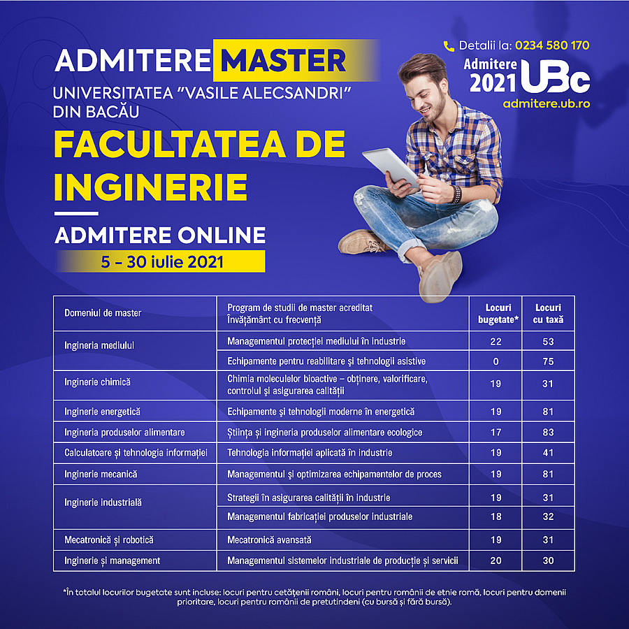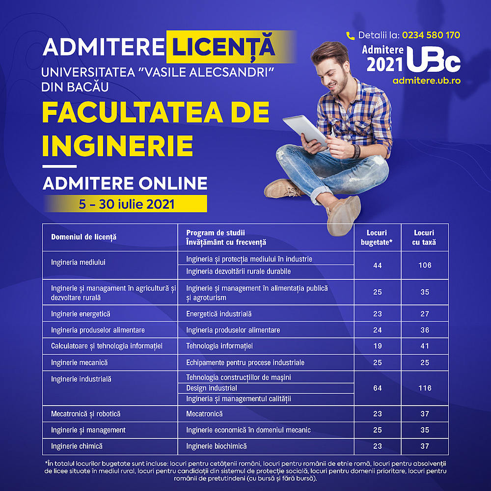 Sub îndemnul „Ingineria profesia viitorului”, Facultatea de Inginerie a Universității „Vasile Alecsandri” din Bacău organizează pentru anul universitar 2021-2022, admitere la ciclurile de studii universitare de licență, master, doctorat și conversie profesională.