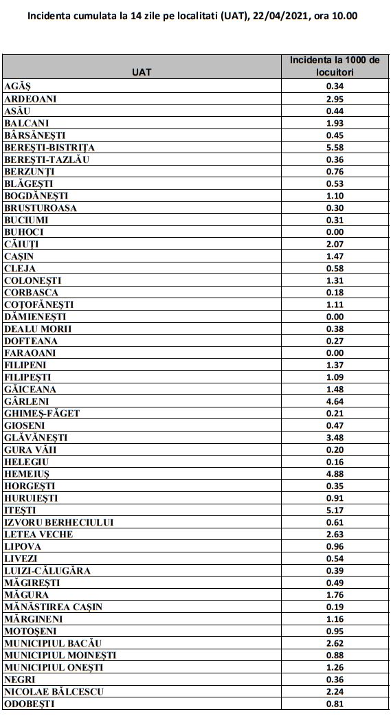 Deși de la începutul acestei săptămâni, rata de incidență COVID a scăzut sub 0,3% (3 la mie) în municipiul Bacău, orașul rămâne în continuare sub restricții ca și când ar avea o rată de peste 0.3 la sută (3 la mie) până pe 2 mai, când se va reanaliza situația de către Consiliul Județean pentru Situații de Urgență.