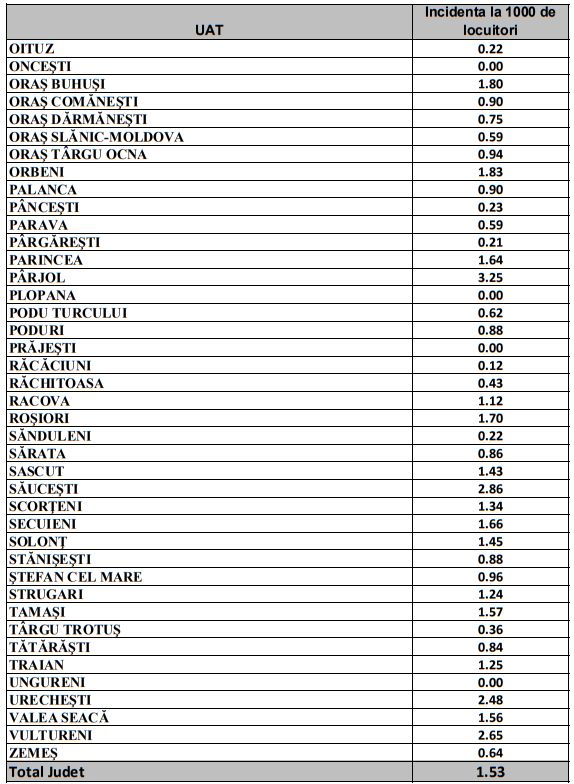 Rate mai mari au localitătile Berești – Bistrița (0,558 % sau 5,58 la mie), Gârleni (0,464 % sau 4,64 la mie), Itești (0,515 % sau 5,15 la mie) și Hemeiuș (0,488% sau 4,88 la mie).