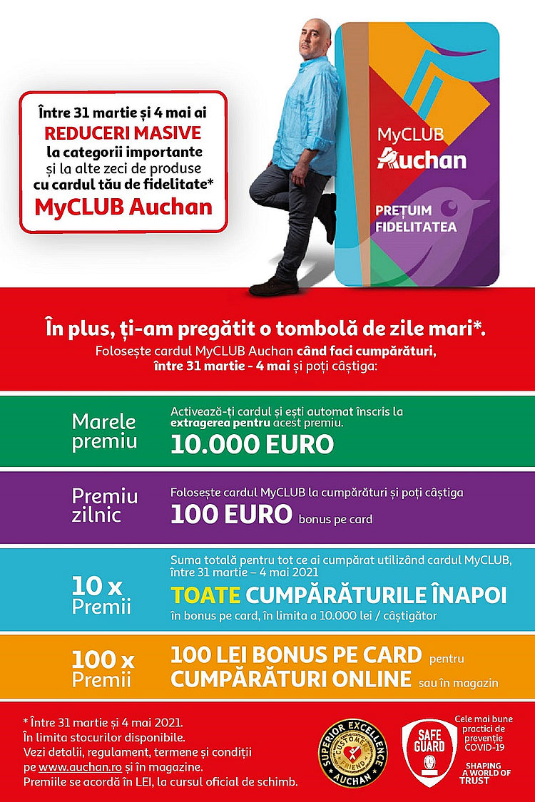 10 premii x toate cumpărăturile înapoi, prin returnarea integrală a sumei cheltuite pentru toate cumpărăturile efectuate prin cardul MyCLUB Auchan în perioada 31 martie – 4 mai, în limita a 10.000 lei/câștigător, în bonus pe card