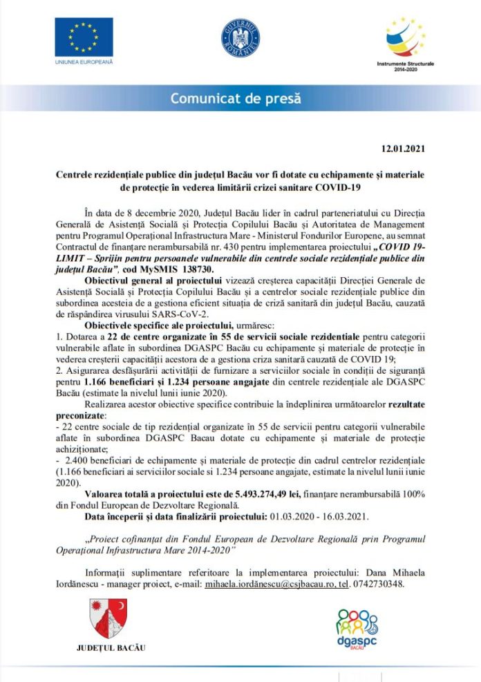 „În județul Bacău a început prima etapă din Strategia Națională de vaccinare împotriva Covid-19, care se adresează personalului din domeniul medical și social. (…) Centrele de vaccinare vor funcționa cu avizul Direcției de Sănătate Publică, fiind coordonate de medici, iar vaccinarea se realizează de către personal medical avizat care a participat și continuă să participe, în etape, la sesiuni de instruire. La nivel local, se organizează Nucleul Local de Coordonare ce asigură implementarea măsurilor dispuse de Comitetul Național de Coordonare a Activităților privind Vaccinarea și Centrul Județean de Coordonare și Conducere a Intervenției. Toată activitatea de vaccinare se va desfășura în baza unei programări. Programarea se face într-o platformă unică, telefonic, online sau prin intermediul medicului de familie. Fiecărei persoane i se vor furniza informații privind vaccinarea și conduita în cazul apariției reacțiilor adverse postvaccinare, existând o monitorizare în acest sens, după caz. Vaccinarea este voluntară și nu este obligatorie, întrucât este un drept și nu o obligație.”