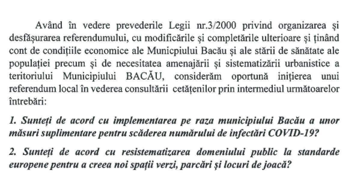 „Rămâne la latitudinea Consiliului Local, în ansamblul său, să hotărască dacă, în contextul pandemic foarte complicat în care se află Bacăul, organizarea unui referendum este, cu adevărat, o prioritate în detrimentul altora.