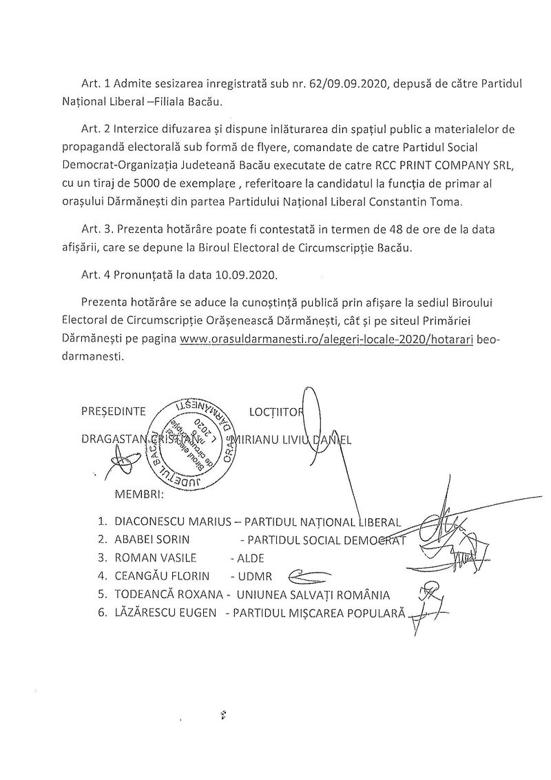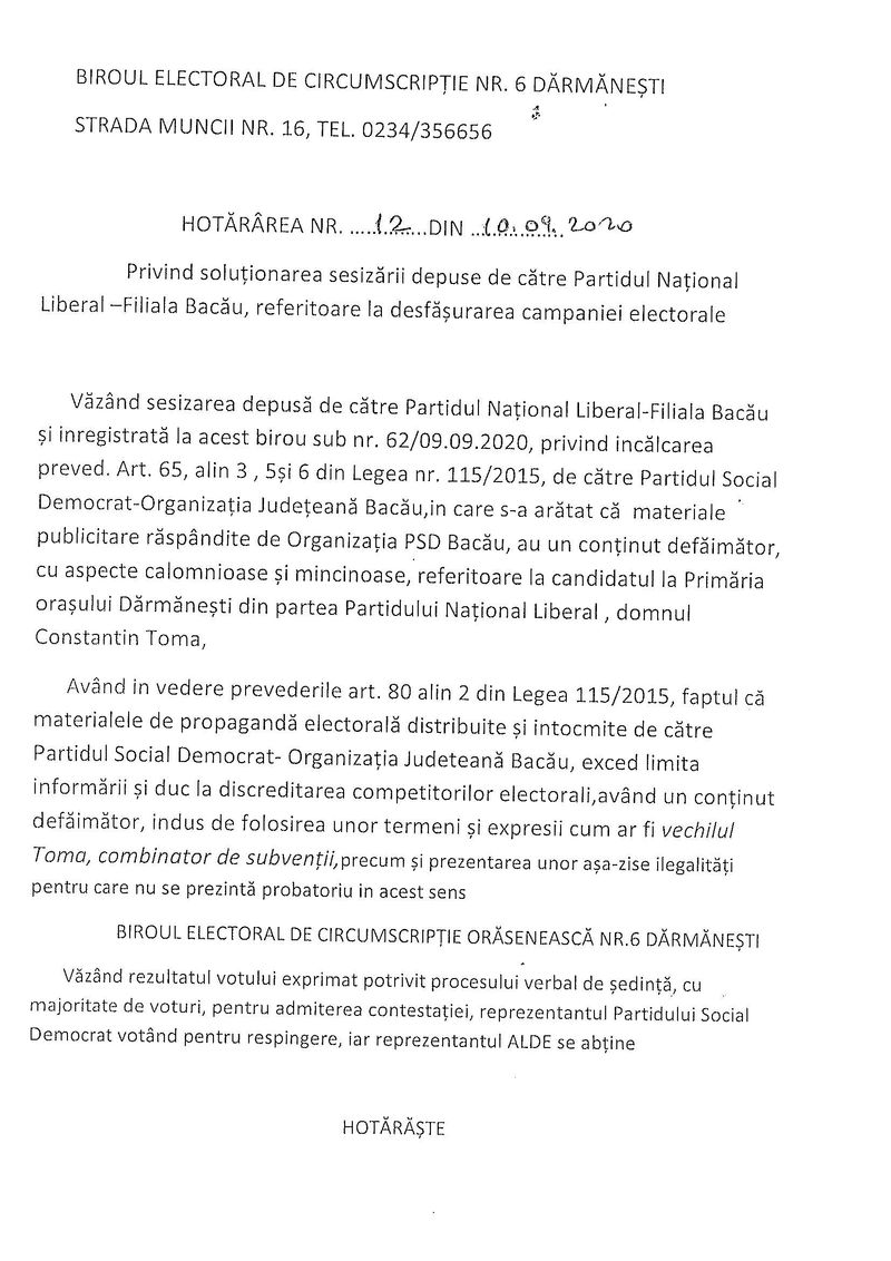 Biroul Electoral de Circumscripție Dărmănești a admis sesizarea depusă de PNL, împotriva practicii continuate a PSD Bacău de a difuza în spațiul public materiale mincinoase, defăimătoare. BEC a dispus retragerea de îndată a celor 5.000 de flyere cu conținut calomniator, împărțite de PSD Bacău, la adresa lui Constantin Toma, primarul din Dărmănești, candidatul PNL pentru un nou mandat.