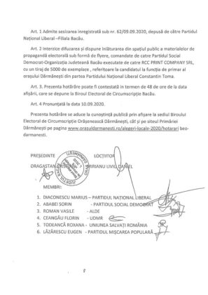 Aceasta este cea de-a doua sesizare admisă a PNL Bacău împotriva practicilor PSD, precedenta având ca obiect materialele defăimătoare la adresa canditatului alianței PNL – USR-PLUS, pentru președinția Consiliului Județean Bacău, Ionel Palăr. Și în acest caz, Biroul Electoral Municipal a dispus retragerea de pe piață a materialelor calomniatoare.