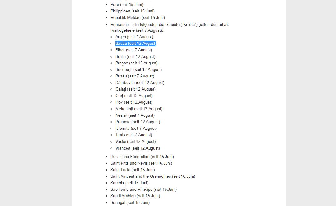 Județul Bacău, inclus de Germania pe lista „zonelor de risc”