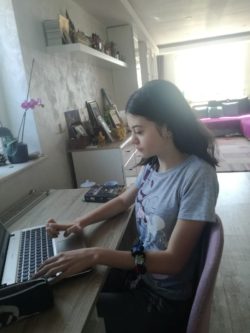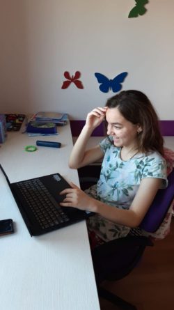 Așa că îndemnată de părinți și de doamna dirigintă care a fost alături de noi încă din prima clipă (începând cursurile online chiar din prima săptămână) am hotărât să folosesc această perioadă în favoarea mea. Am început să lucrăm online foarte repede și foarte bine, având în vedere situația dată, atât la română, cât și la matematică, chiar și la geografie. A fost mai greu la început, dar pe parcurs lucrurile au mers din ce în ce mai bine, ceea ce m-a motivat și am început să lucrez individual, ca și cum aș fi fost la școală. E adevărat că nu a fost ușor, dar am reușit. Am încercat să o văd ca pe o provocare și nu ca pe o corvoadă, spunându-mi tot timpul că este în avantajul meu, pentru că sunt mult mai odihnită și datorită faptului că nu trebuie să mai învățăm la celelalte obiecte, nu mai există presiunea testelor și ascultărilor.”