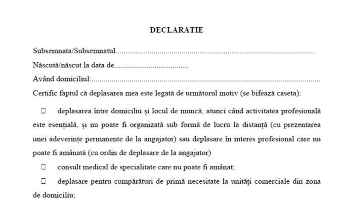 (4) Declarația pe propria răspundere trebuie să cuprindă nume și prenume, data nașterii, adresa locuinței/ gospodăriei/ locului activității profesionale, motivul deplasării, data completării și semnătura.