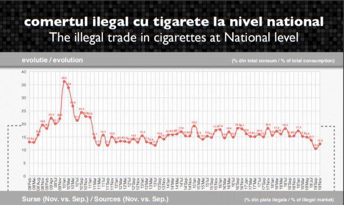 Piața neagră a țigaretelor înregistrează în noiembrie prima creștere din acest an, de 1,8 p.p. până la 12,3%, față de 10,5% în septembrie.